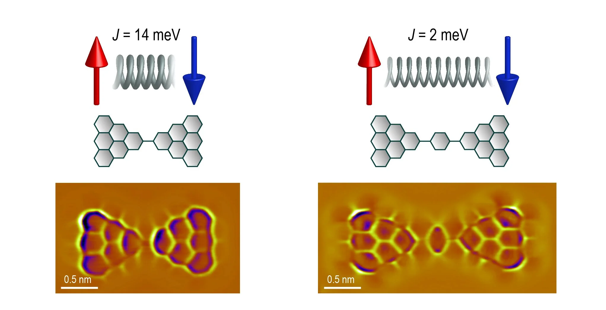 Upper row: Schematic diagram of the antiferromagnetic coupling between two triangulenes connected with (right) or without (left) “spacers”. The numbers indicate the experimentally measured exchange energy. Bottom row: Scanning tunneling microscopy images of the triangulene dimers.