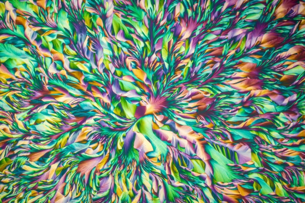 A breathtaking fusion of science and art, this image reveals the intricate beauty of crystalline formations through polarized light microscopy, highlighting the spontaneous self-assembly of molecules.